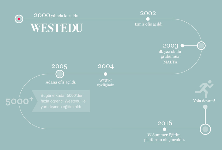 2000’den bugüne, WESTEDU ismiyle heyecan ve tutkuyla dolu bir yolculuk başladı. 5000’den fazla öğrencinin; akademik geçmişine, yeteneklerine, kariyer hedefine, kişisel beklentilerine ve bütçesine uygun eğitime erişimini sağladık. Elde ettiğimiz sonuç; her zaman, güven, memnuniyet ve mutluluk oldu.